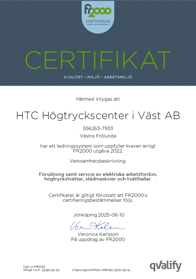 Högtryckscenter i Väst AB är certifierade enligt FR2000 standarden, vilket innebär att vi har ett ledningssystem gällande kvalitet, miljö, arbetsmiljö, kompetens, brandskydd och socialt ansvarstagande.