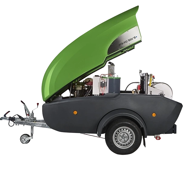 För detta ändamål har högtryckstvätten på släpvagnen en vattenkyld Kubota-dieselmotor som, styrd av DiBO-styrenheten, exakt hanterar alla motorparametrar. Den är också utrustad med en energibesparande 2-stegs bränslepump för GreenBoiler.